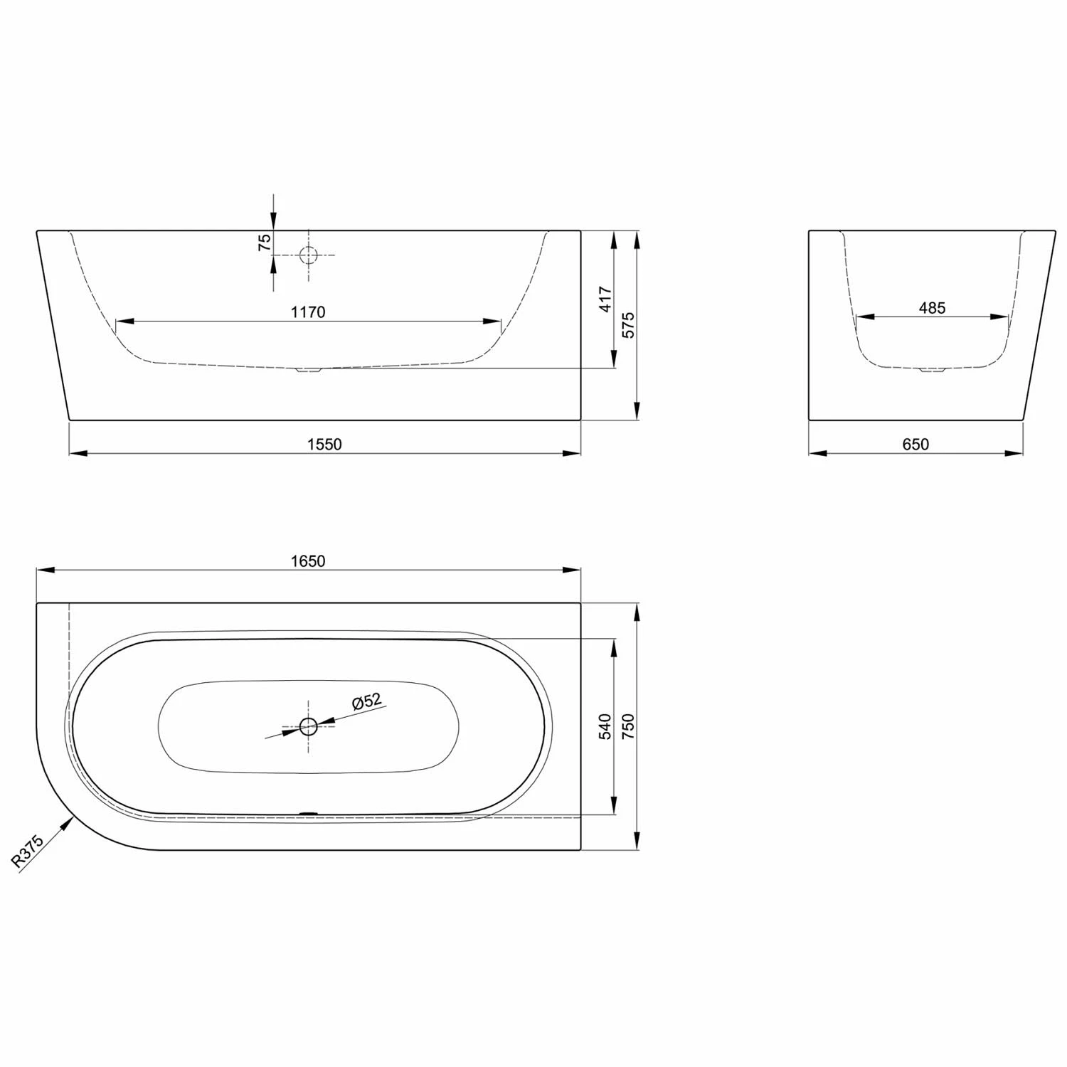 - Stahlbadewanne mit den Maßen: L: 165 B: 75 H: 42 cm