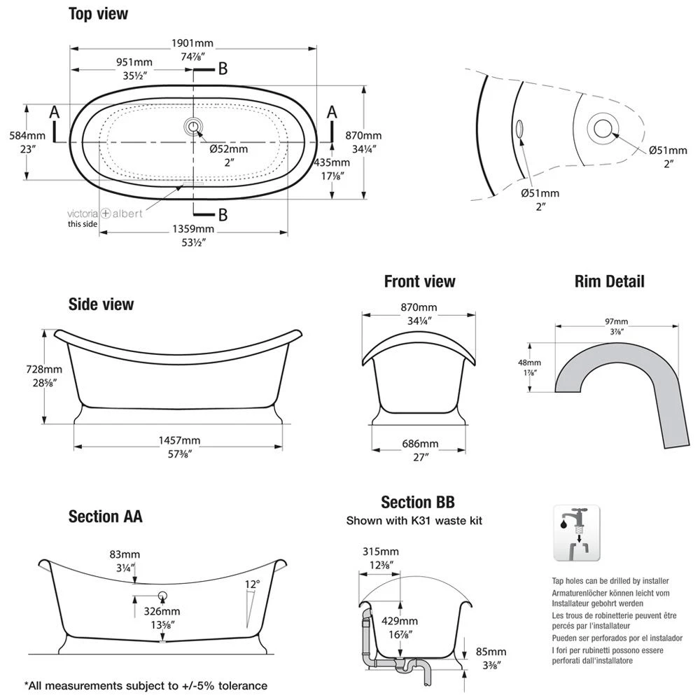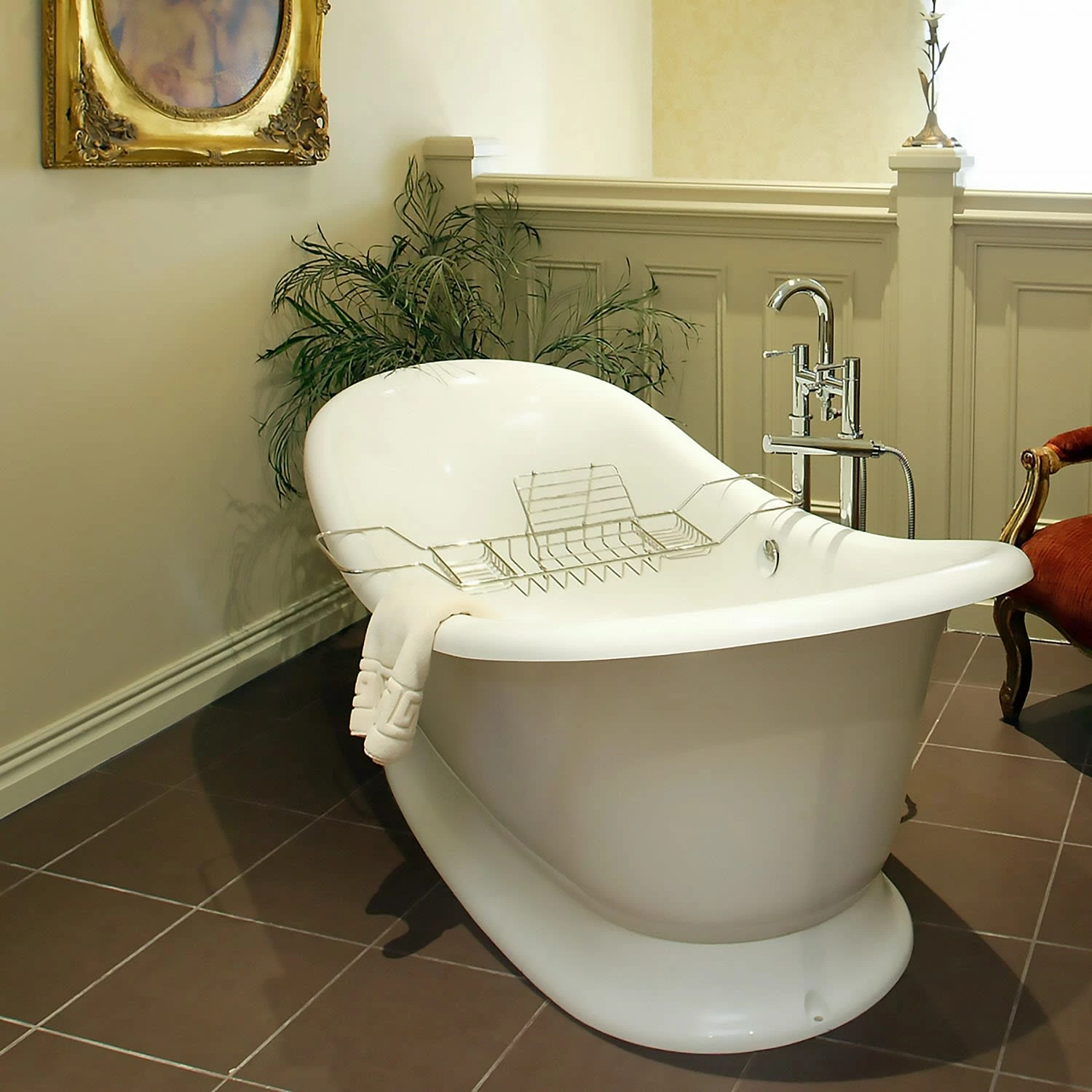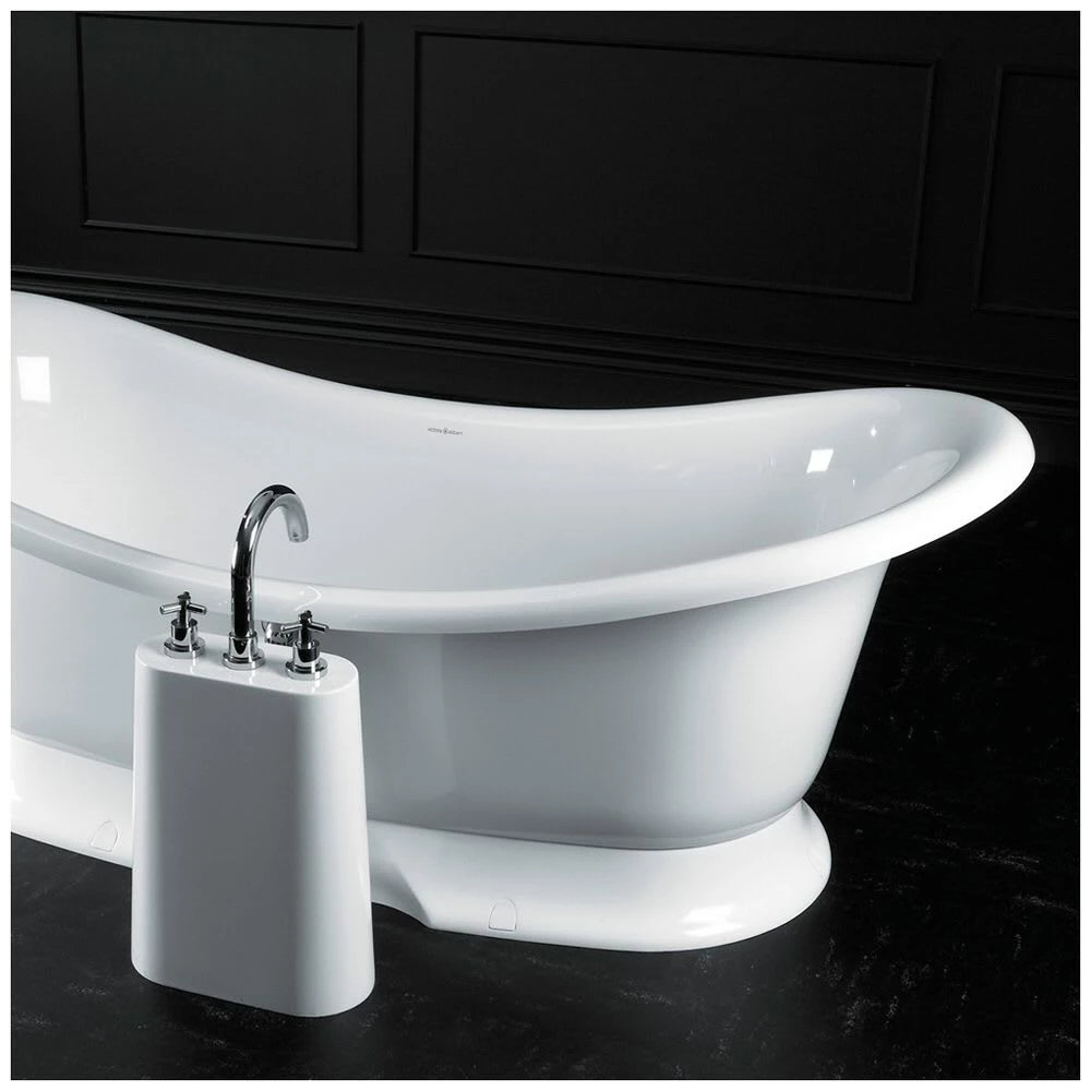 Geeignet für freistehende oder an der Wand montierte Wanneneinläufe, aufgrund des Randes können in diese Wanne keine Armaturenlöcher gebohrt werden.
